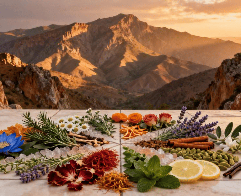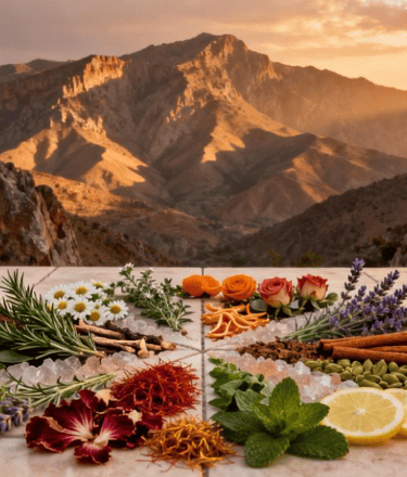 Sélectionnés un à un sur les terres marocaines, ces ingrédients rares et nobles sont choisis pour leur pureté, leur origine et leur résonance subtile avec le corps et l’esprit, selon l’héritage vivant des savoirs amazighs: